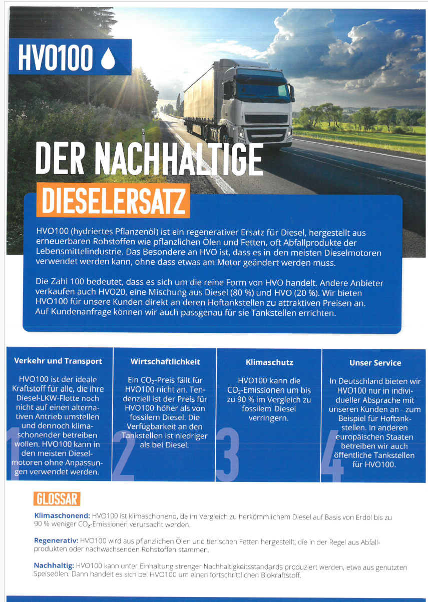 Alternative Kraftstoffe wie HVO sind verfügbar, aber mit einem Mehrpreis von 0,05 bis zu 0,20 € pro Liter verbunden.