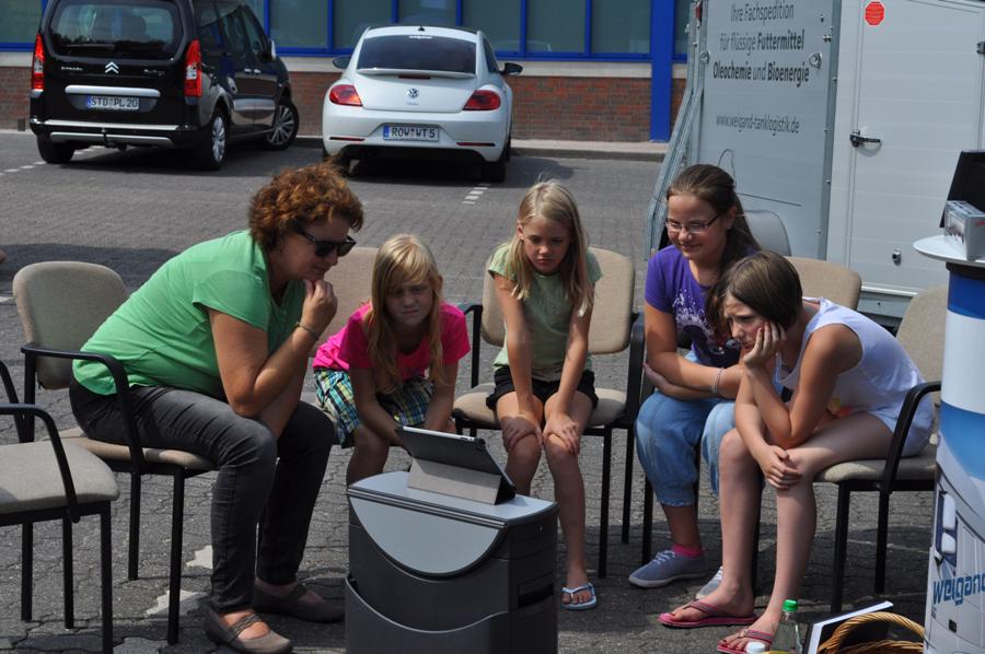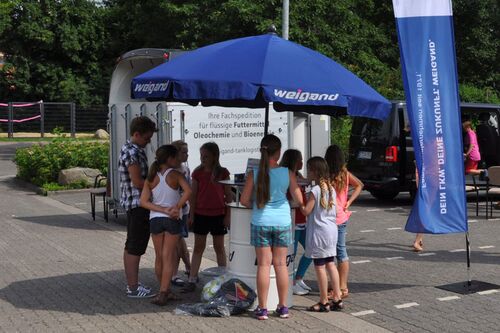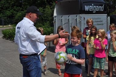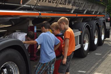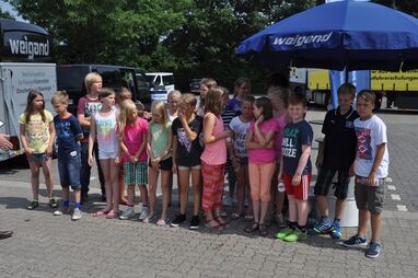 Die Kinder staunen: „Das ist ja nicht einfach nur ein Auto. Da drinnen gibt es einen Kühlschrank, einen Fernseher und sogar ein Bett!“ Dennis Everding, Ausbilder bei der Firma Weigand lacht und erklärt den neugierigen Grundschülern, dass sein Fahrerhaus für ihn nicht nur ein Arbeitsplatz sondern eben auch Küche, Schlaf- und Wohnzimmer ist. Und ein Mädchen strahlt: „Hier würde ich am liebsten gleich einziehen!“