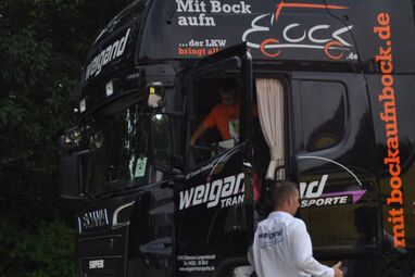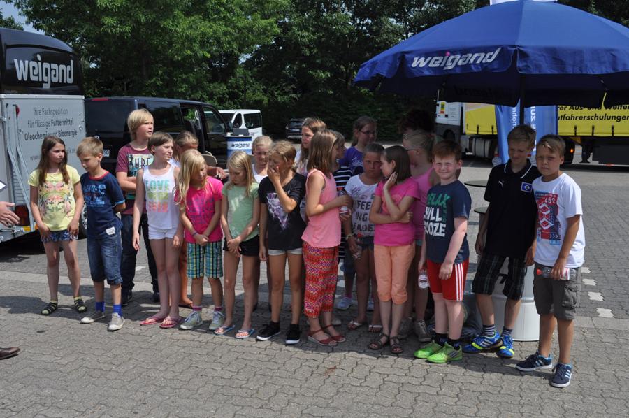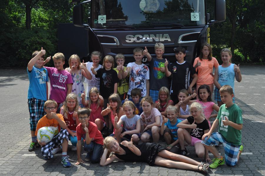 Everdings eindrucksvoller schwarzer V8 Scania war nur eine der vielen Attraktionen, die den Schülern der Rosenborn-Grundschule Harsefeld geboten wurden. Auf Einladung der SVG Stade, der Firma Weigand und der Verkehrspolizei erlebten sie am 21.07. auf dem Parkplatz der Eishalle Harsefeld einen höchst ereignis- und lehrreichen Vormittag.