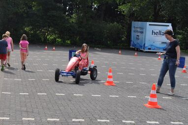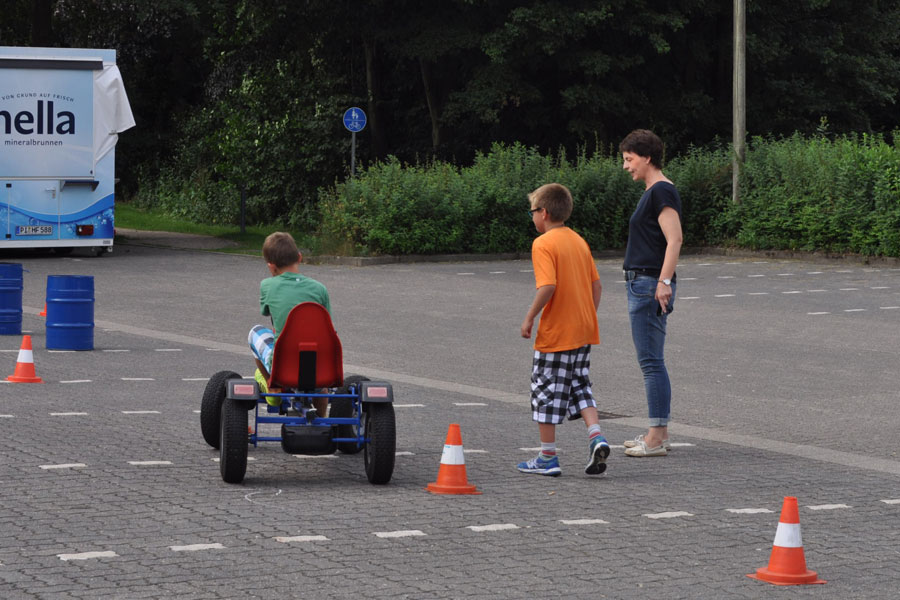 Ein weiteres Highlight: Der von Ina Weigand organisierte Kart-Parcours, in dem die Schüler der verschiedenen Klassen miteinander wetteiferten. Dabei war nicht nur die Zeit entscheidend. Neben Slalom- und Tonnendurchfahrt galt es ganz alltagsorientiert, auch richtig rückwärts einzuparken. Die stolzen Sieger freuten sich über Lederbälle, Rucksäcke und Modell-LKW. Ina Weigand zeigte sich von den gezeigten Leistungen beeindruckt: „Da waren schon ein paar richtige Profis dabei!“