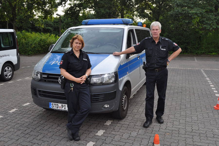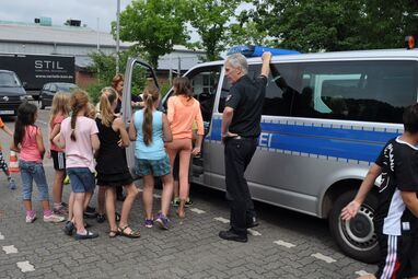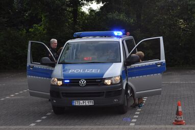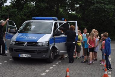 Die Beamten Groeger und Kolbe stießen ebenfalls auf großes Interesse als sie demonstrierten, wie ein Polizei-Bulli von innen aussieht. Sie führten vor, wie man eine Unfallstelle ausmisst und wie Blaulicht und Stop-Signal funktionieren. Auch hier gab es keine graue Theorie, die Schüler konnten vieles direkt ausprobieren. „Mann, ist so eine Sicherheitsweste schwer!“ war nur einer der vielen Kommentare, die die Freunde und Helfer schmunzeln ließen.