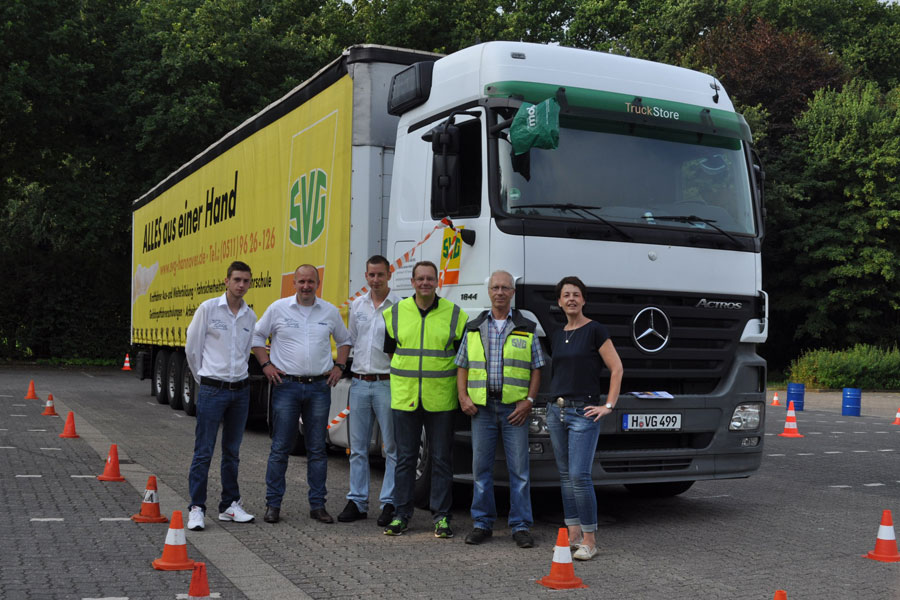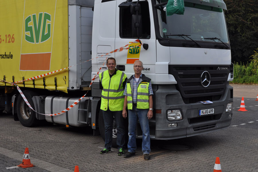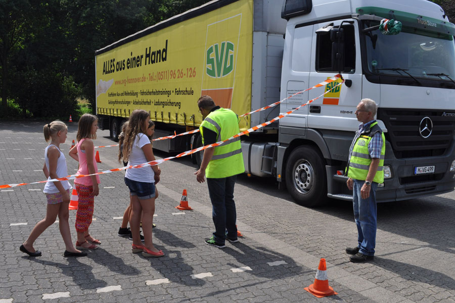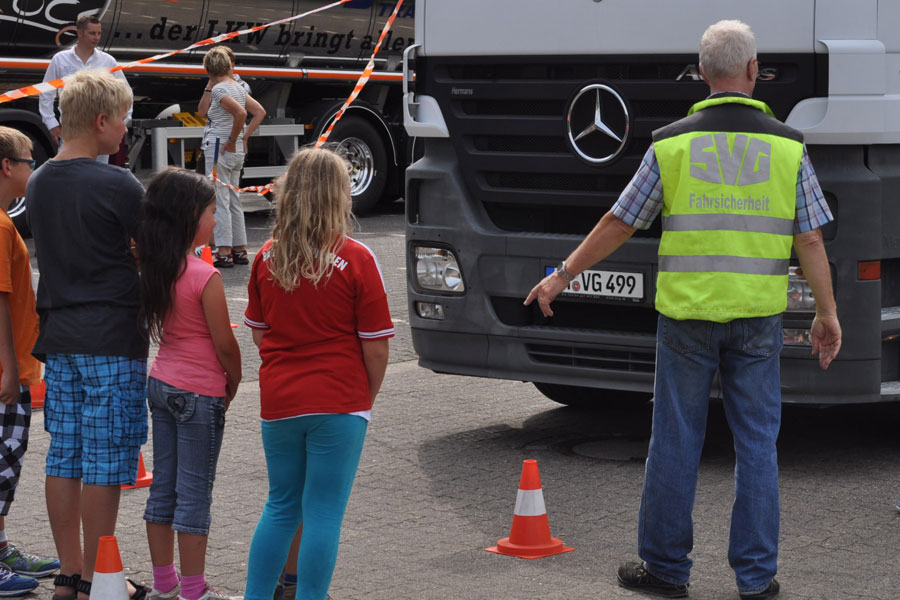 Jörg Ehlers und Bernd Klich von der SVG kümmerten sich dabei um ein besonders wichtiges Thema und zeigten eindrucksvoll, wie groß der tote Winkel für einen LKW-Fahrer ist. Die kleinen Zuschauer waren überrascht: „So kann der mich ja überhaupt nicht sehen!“ Eine Einsicht, die Leben retten kann! Und die Vertreter der SVG demonstrierten noch einen weiteren oft unterschätzten Gefahrenaspekt: „Oft beachten die anderen Verkehrsteilnehmer nur die Zugmaschine eines LKW und übersehen vor allem in Kurven die Gefahr, die vom Auflieger ausgeht.“ Die Botschaft war klar und wurde von den Kindern schnellstens umgesetzt: „Ist doch klar! Aufpassen und Abstand halten! Und davon nicht zu knapp!“