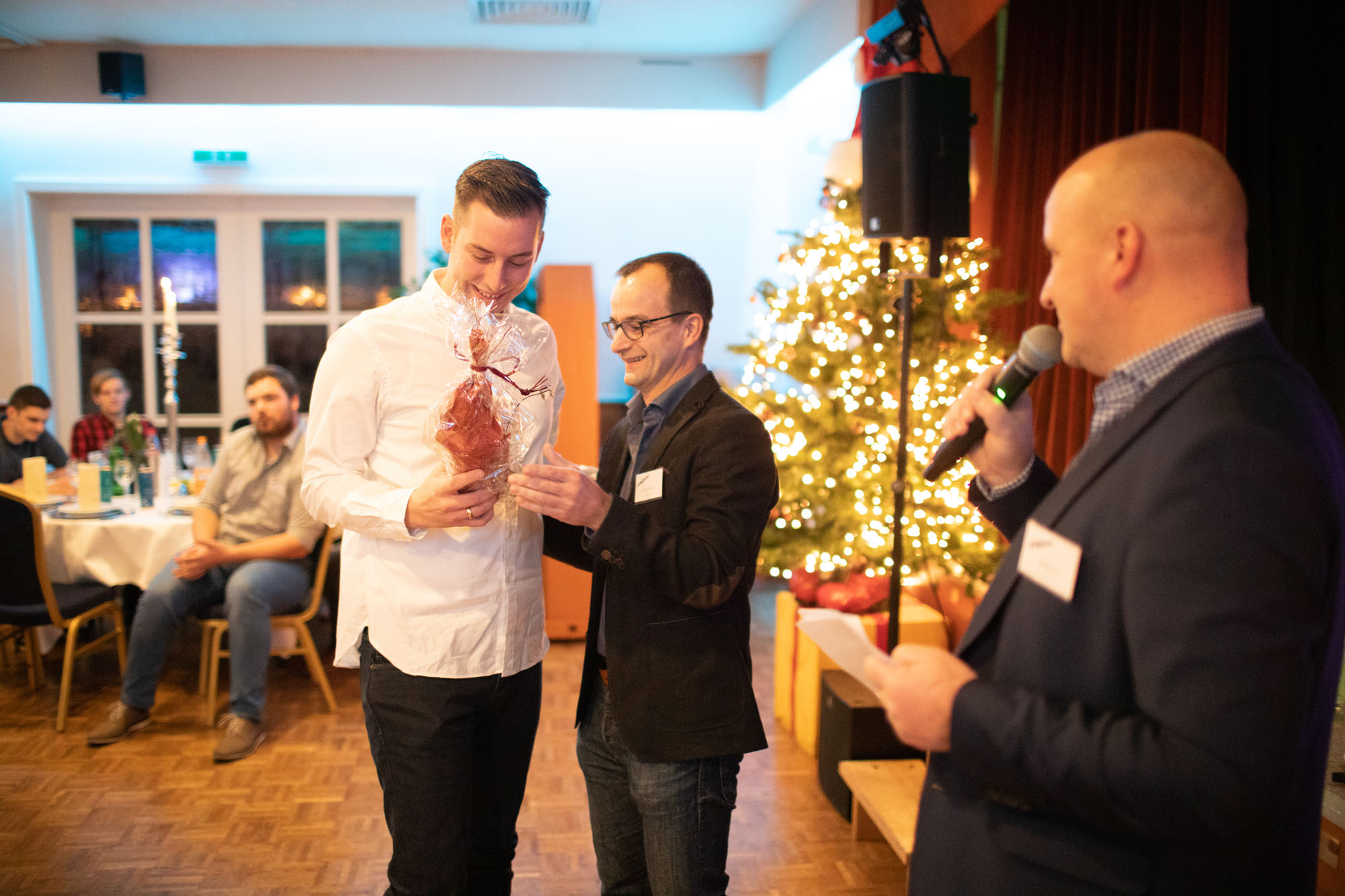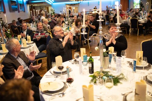 Pünktlich zum ersten Adventswochenende verwandelte sich das Kräuterhotel Heidejäger Mulmshorn am 1. Dezember in ein Winter-Wunderland für alle Weigander: Rund 100 Mitarbeiter von Weigand-Transporte, Waschross und Weigand-IT kamen gemeinsam mit ihren Partnerinnen und Partnern im festlich dekorierten Saal für die diesjährige Weihnachtsfeier zusammen. Um 17 Uhr begann der Abend zunächst mit einem herzlichen Empfang, bevor Stefan und Karsten ihre Mannschaft mit einer stimmungsvollen Rede begrüßten. Dabei ging es bisweilen auch emotional zu, denn neben dem Rückblick auf das erfolgreiche Jahr 2018, der wohl alle Weigander mit Stolz erfüllte, gab es einige Ehrungen zu verkünden: Der Geburtstag von Ditmar Winden und die Danksagung an die Jubilare im Team Weigand waren dabei zunächst nur der Anfang. Vor allem die Verabschiedung von Helmut Moritz, der das Team nach 11 Jahren zuverlässiger Treue nun verlässt, ging vielen im Saal zu Herzen. Seit 2007 hat der Profi-Fahrer seinen Tanker für die Weiße Flotte über die Straßen gesteuert – mit seiner freundlichen Art und seinem starken Engagement wird er allen auch als zukünftiger Ruheständler in bester Erinnerung bleiben.