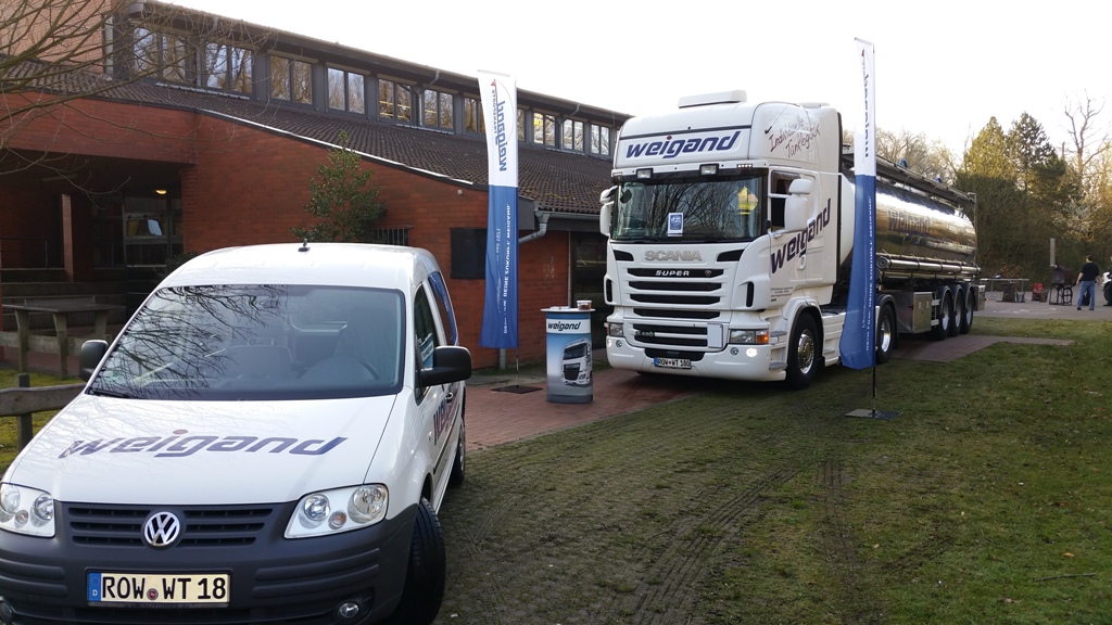 Wir und 9 weitere Firmen aus diversen Berufsfeldern (Gastronomie, Altenpflege, uvm.) bauten eine Vielzahl von Stationen auf, an denen berufstypische Tätigkeiten durchgeführt und dabei von Fachkräften und Auszubildenden betreut wurden. Aus unserem Team vertreten waren Dennis Everding und Enrico Ripke. Sie erklärten das Trucktablet der Fahrer, den digitalen Tacho, den Aufbau des Tankzuges und des Fahrerhauses inklusive des Innenraumes. Zu den praktischen Übungen gehörten zum Beispiel: Ölstand- und Reifendruckkontrolle. Auf diese Weise lernten die Schüler/innen mehrere Berufsfelder kennen und konnten sich ein Überblick verschaffen, welches ihnen am Besten gefällt. Die Weigand Mitarbeiter waren begeistert von den Schülern und hatten viel Spaß.