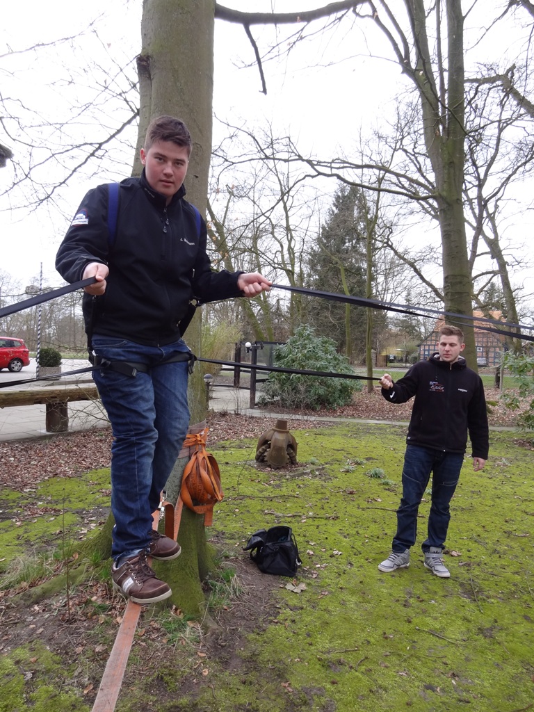 Aus dem langweiligen Thema „Arbeitssicherheit/PSA“ wurde das TPTP-Programm mit Sicherheitsexperimenten auf einer Slackline sowie Praxistest und Sturzsimulation im Waschross.
