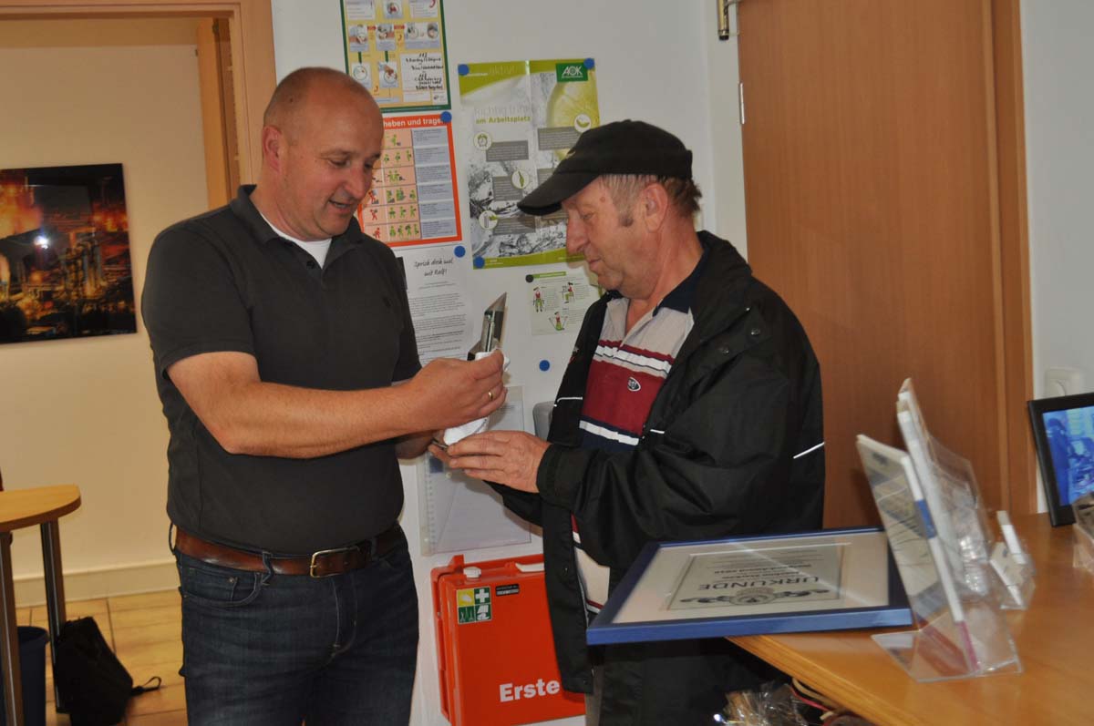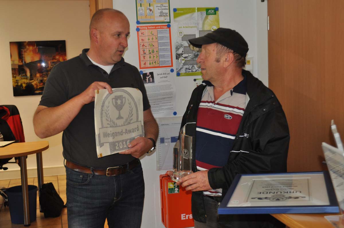 Die Geschäftsleitung gratuliert herzlich zum gewonnenen Weigand-Award und überreicht dem Weigander Joachim im feierlichen Rahmen die gerahmte Urkunde und den schönen Glaspokal des Awards 2016.