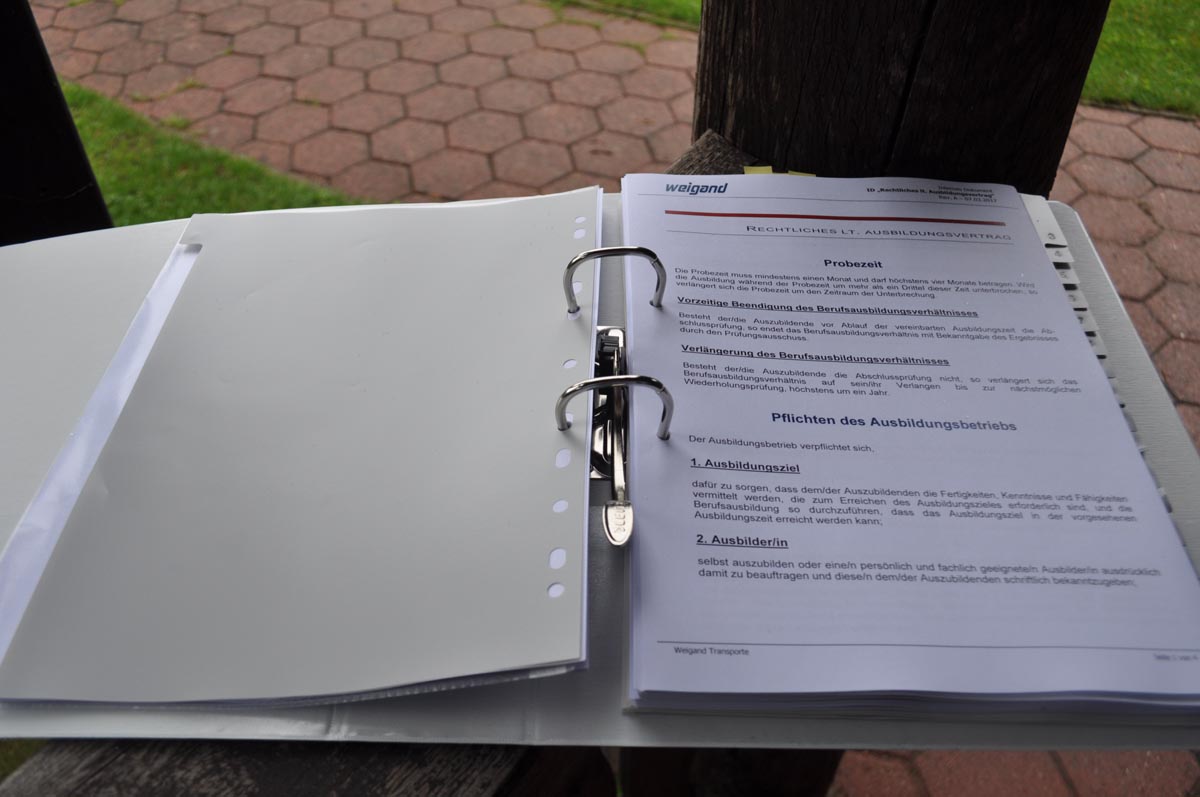 Dann wurde der neue Ausbildungsplan von Stefan Schulz von Coniunctum vorgestellt. Ganz neu ist der Ausbildungsordner, der in Kooperation von Ina Weigand, Dennis Everding und Stefan Schulz erstellt wurde. Dieses tolle Hilfsmittel für die Ausbilder bei Weigand-Transporte enthält zahlreiche Checklisten, Informationen zur Ausbildung und zur Bewertung der Auszubildenden sowie den neuen Ausbildungsrahmenplan in fünf Blöcken. Herzlichen Dank an das Trio, das diesen wertvollen Ordner für Weigand zusammengestellt und erarbeitet hat.