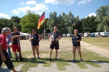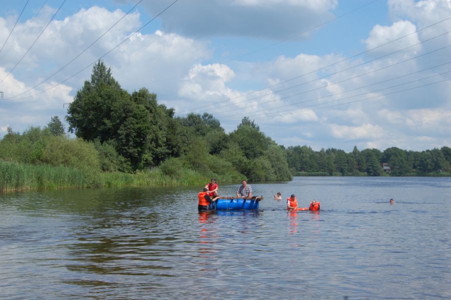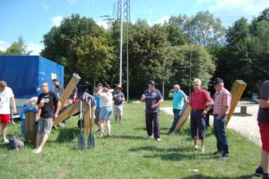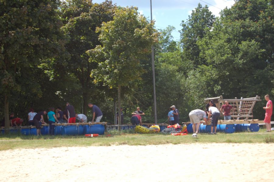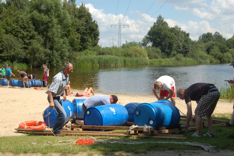 Nachdem alle nass sind und der Schatz gefunden ist, demontieren die Gruppen die Flöße und es wird mit kühlem Bier in lockeren Runden gelacht, geschnackt und gefachsimpelt.