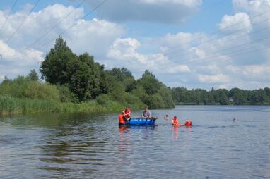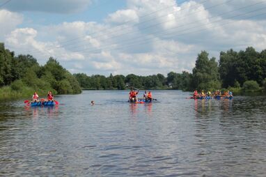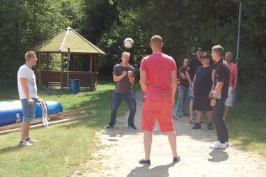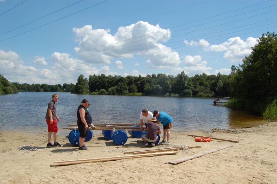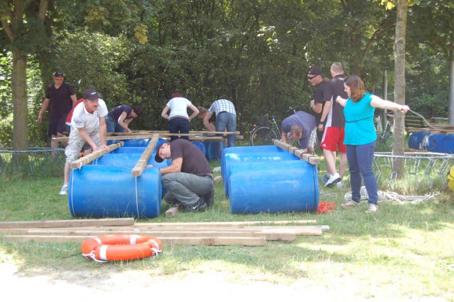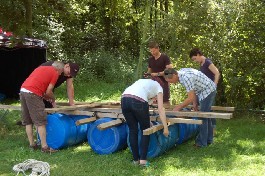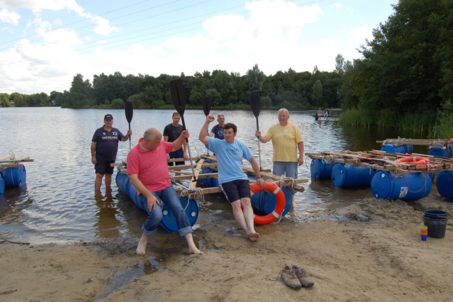 Nach kräftiger Brotzeit im Strandhaus beginnen die Mitarbeiter, in kleinen Gruppen ihr Floß zu bauen. Die Gruppen entwickeln unterschiedliche Baumuster und treten dann zu einer Floßregatta im Weichelsee an. Es ist eine super Gaudi – alle Flöße sind seetauglich und natürlich sind die meisten Floßfahrer klitschnass und teilweise gehen auch Besatzungsmitglieder über Bord. Nach der Regatta wird der Piratenschatz im Weichelsee geborgen, dafür müssen die Teams das Schokorätsel lösen und erhalten die GPS-Koordinaten vom Fundort. Ausgestattet mit GPS-Geräten stechen die Gruppen mit ihren Flößen wieder in See und machen sich auf die Schatzsuche.