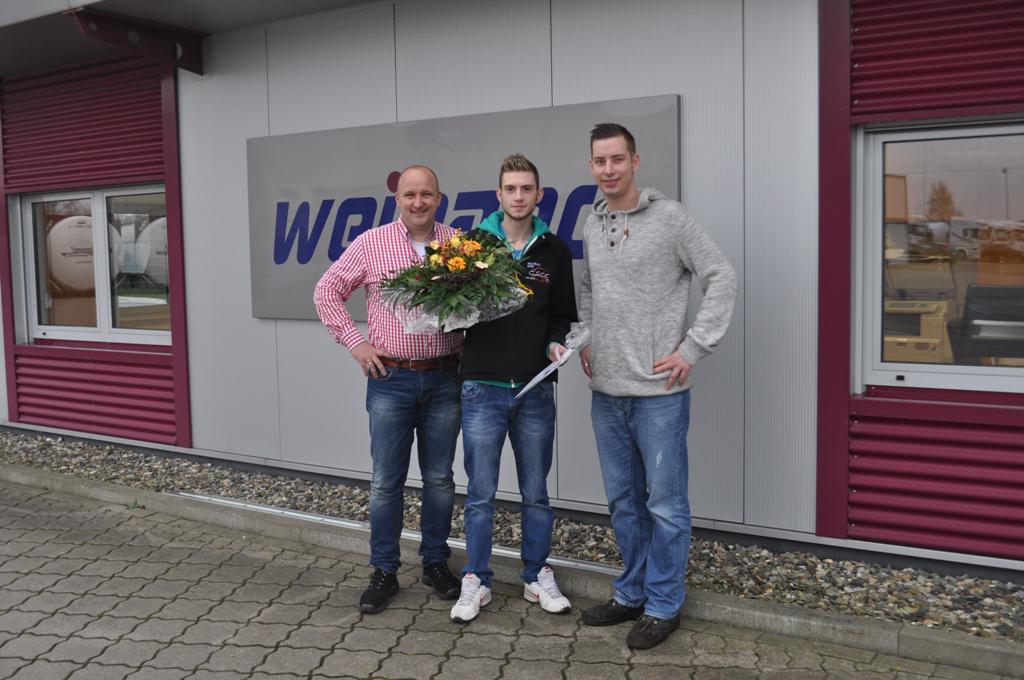 Florian hat am 01.08.2013 seine Ausbildung zum Berufskraftfahrer bei uns begonnen und ist von Neuruppin nach Sittensen gezogen. Er war mit sehr viel Leidenschaft dabei und alle Ausbilder schätzten seine freundliche Art und die sehr gute Arbeitsleistung. Der Geschäftsführer Stefan Weigand und der Fuhrparkleiter Dennis Everding gratulieren persönlich zu diesem Erfolg und übergeben einen Blumenstrauß und einen 50,00 € Gutschein für ein persönliches Ausstattungsaccessoire von SCANIA.