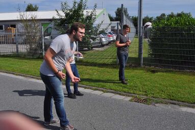 Im Parcour-Teil haben die Neuen die einzelnen Mitarbeiter von Weigand interviewt und deren Aufgabenbereiche erfragt. Das Wetter war spitze und hat ebenfalls super mitgespielt, so dass alle bei bester Stimmung den ersten Teil der Einweisung beenden konnten. Gewonnen hat das Cross-Boccia-Spiel Marvin, der damit seinen ersten Erfolg am ersten Tag im neuen Job verbuchen konnte.